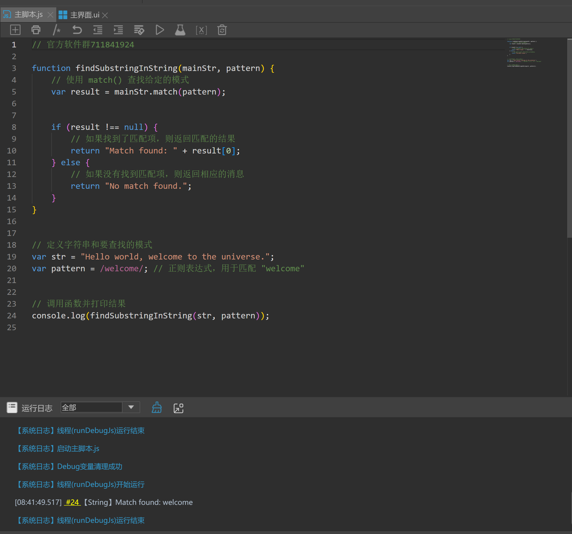 // 官方软件群711841924 // 定义 findSubstringInString 函数 function findSubstringInString(mainStr, pattern) { // 使用 match() 查找给定的模式 var result = mainStr.match(pattern); if (result !== null) { // 如果找到了匹配项,则返回匹配的结果 return "Match found: " + result[0]; } else { // 如果没有找到匹配项,则返回相应的消息 return "No match found."; } } // 定义 validateEmail 函数 function validateEmail(email) { var pattern = /^[^\s@]+@[^\s@]+\.[^\s@]+$/; // 简单的电子邮件验证正则表达式 return findSubstringInString(email, pattern); } // 调用 validateEmail 函数并打印结果 console.log(validateEmail("user@example.com")); // 输出: Match found: user@example.comconsole.log(validateEmail("invalid-email")); // 输出: No match found.