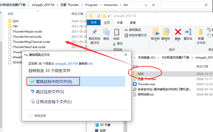 3、an'zhuang'wan'c将下载文件中的SDK整个文件夹复制到迅雷11同目录下(Thunder\Program\resources\bin\SDK),接着将“Thunder.exe”程序复制到(Thunder\Program)目录下进行替换。